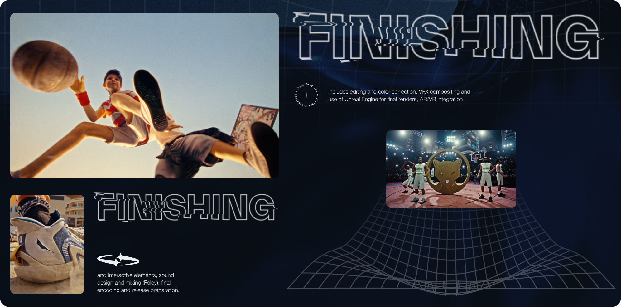 Includes editing and color correction, VFX compositing, AR/VR integration, sound design, and final release preparation.